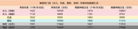 今天测试的目标是“敏固伤门派”(女儿、地府、无底和普陀),考虑到盘丝和天机和“敏固伤门派”输出机制不同,所以这篇推文中没有他们!