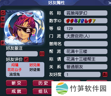 帮主的游戏ID为“孤狼闯梦幻”,他创建了“花满十三楼”帮派,编号是339。经过帮主的一番运营,帮派规模提升至5级,现有帮派成员181位,人气度、安定度等帮派指数都特别高。