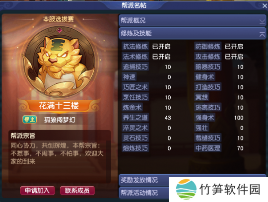 帮派设置了法术、攻击、抗法和防御四修,辅助技能则主要研究强身术和中药医理。招募宗旨是同心协力,共创辉煌,欢迎志同道合玩家的到来。