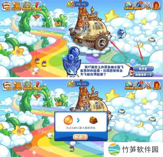 1、前往天空城的彩虹河流,点击冥狐,帮助完成任务,即可得到火灵石。