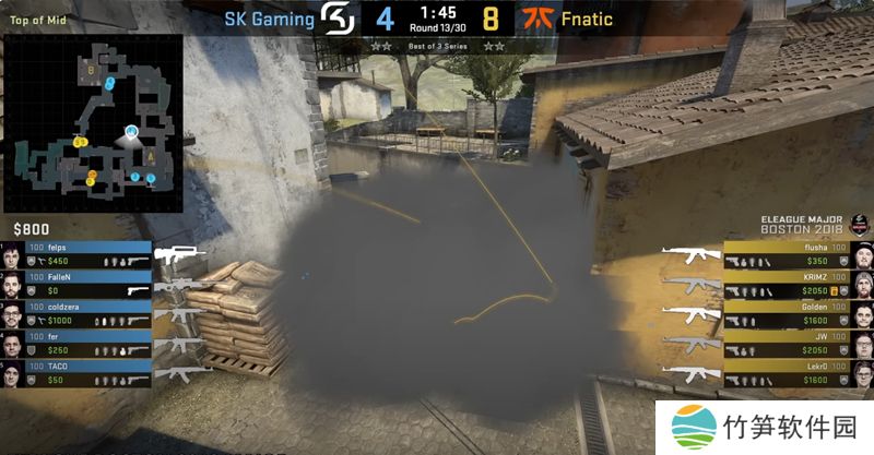 随着版本的发展以及战术的不断迭代,越来越多的进攻方意识到石板的争夺成为香蕉道控制的关键所在。于是,在2018年,以fnatic为代表的一种队伍开发出了新的烟雾弹战术,这颗烟雾弹能直接绕过石板,在黄车和沙袋中间炸开。这样做的好处是大大压缩了CT方的防守空间,另外也把香蕉道切割成了对T方更有利的样子。