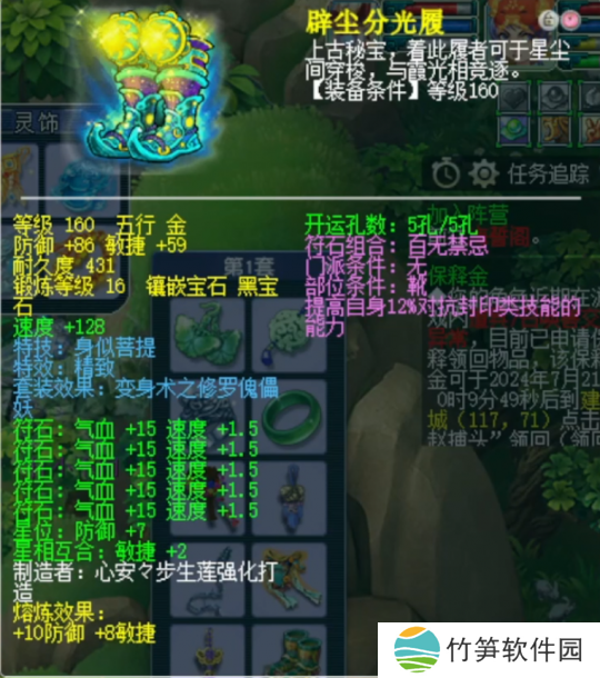 160级笑里藏刀鞋子,基础防御108,基础敏捷67,镶嵌16锻黑宝石,附加1.47%封印命中率特性。