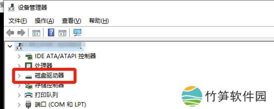 2、接着在设备管理器页面下,点击下方的【磁盘驱动器】选项