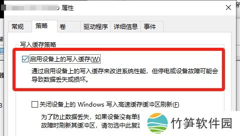 5、最后取消勾选【启用设备上的写入缓存】功能,点击确定按钮即可