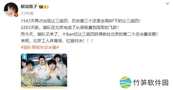 1547天再次出现让三追四,历史第三个还是全局BP下的让三追四!2283天前,狼队在北京完成了从保级赛到冠军的飞跃!而今天,狼队又来了,十Ban位让三追四获得前往北京的第二个总决赛名额!来吧,北京工人体育场,红狼对决!!!