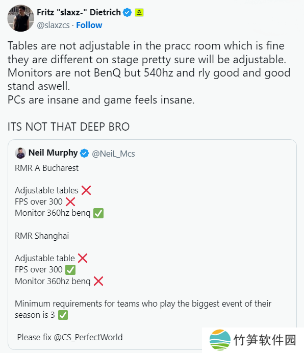 A:我看到有人抱怨桌子高度,没看到全部内容,但我看到了slaxz-的动态,我有点同意他的想法。我认为设备没什么问题,电脑运行得很好。显示器和以前用的不一样,但队员们平常使用的显示器都不一样。我们之前参加过Vitality的训练营,他们有AGON显示器,但不是540 Hz,显示器型号和这次比赛用的不一样,显示色彩也不同,但我认为这不会造成太大的影响。