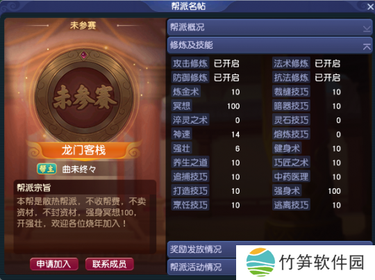 这名帮主在【巫山曲】创建的帮派名称是“龙门客栈”,编号为154。如今帮派规模达到5级,拥有178位帮派成员。帮派主打散热模式,不收帮费,欢迎各种少侠加入!