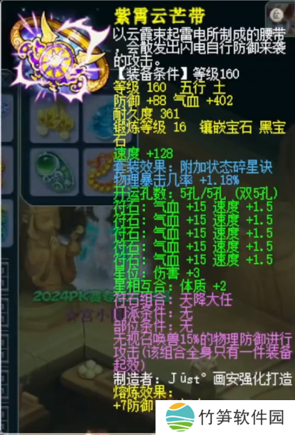 基础防御95,基础气血432,镶嵌16锻黑宝石的腰带,附加特性1.18%物理暴击几率。