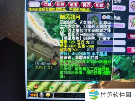 有玩家发来投稿,说他在8月鉴定了一把120级刀,属性伤害+388,命中+496,特效是无级别限制+永不磨损,这运气太好了!