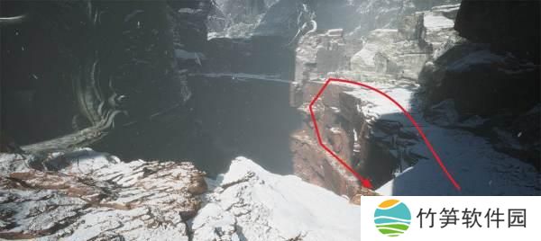 1、从第三回【小西天-浮屠界-经筒外】土地庙往BOSS【魔将·妙音】所在位置的桥走,到悬崖边右转可以看到前方岩壁上凸出了一些大石头,这些石头是可以踩着往下跳的。沿着石头往下跳,按照下图箭头方向前进。