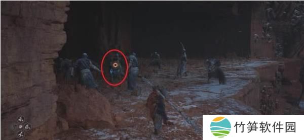 2、按照上图箭头往下跳两层后,应该落在一条山路上,然后按照上图箭头表示方向前进,可以看到前方有一堆雕像站在路边。