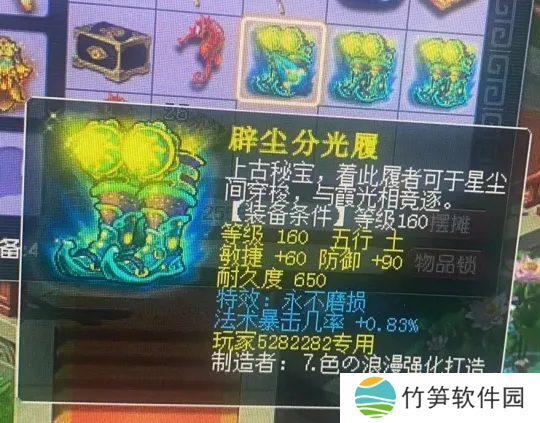 有老板还差一双鞋子,就鉴定了3双160鞋子,没想到其中一件出了专用。自用就就点了,结果意外逆袭,它的防御+90,敏捷+60,特效是永不磨损,还附加法术暴击几率+0.83%。正常来说能卖好几万的,但带了专用,老板号底子还不错价值也得打个折啊!