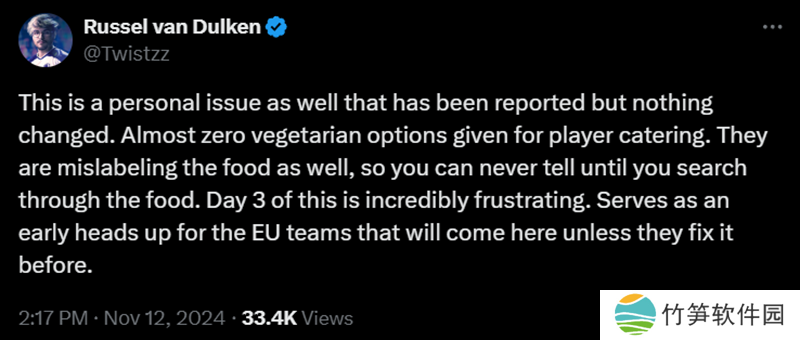 Liquid指挥Twistzz在社媒发文抱怨选手餐饮中素食选项极少。
