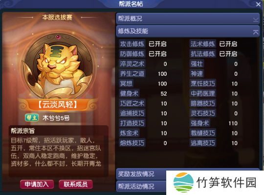 帮派设置了四大主要修炼,辅助技能则主要研究强身术、冥想和养生之道。帮派的目标是升到7级,帮派特点是资材多,使用无限制。