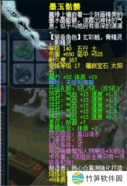 体魔双加57,镶嵌17锻太阳石的140级无级别魔棒。