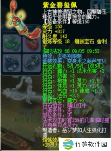 万里少侠的前排灵饰是100级7法伤,基础法伤爆了25(16+9)点,属性非常优秀。