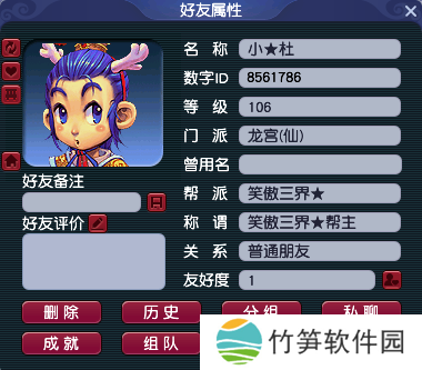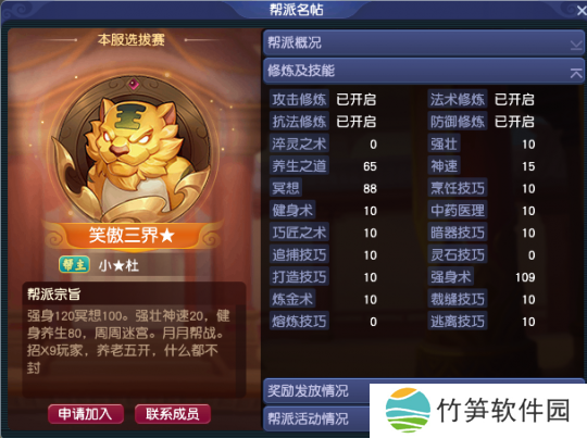 玩家“小★杜”在双龙之战建立帮派“笑傲三界★”,编号是45。如今帮派等级升至5级、成员有155位。帮派资源是什么都不封,主打着周周迷宫,月月帮战的风格!