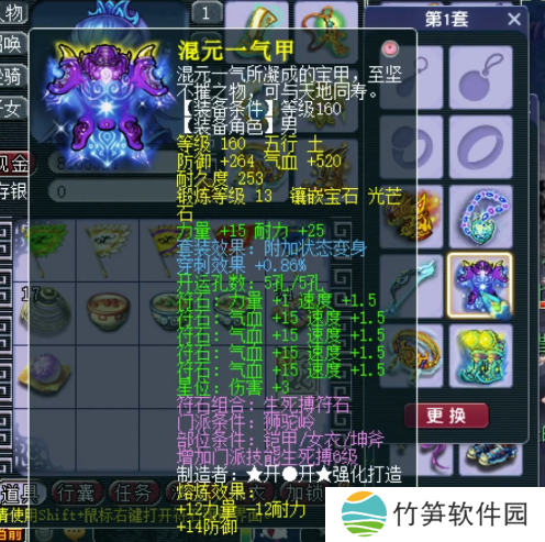 160级变身男衣,13锻光芒石,附加穿刺效果+0.86%,熔炼后防御+278,力量+27,耐力+13。