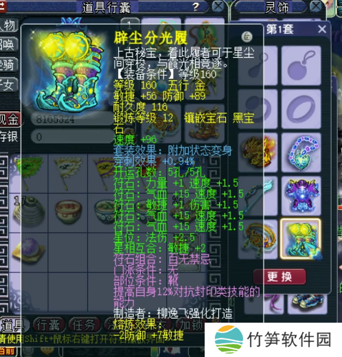 160级变身鞋子,附加穿刺效果+0.94%,12锻黑宝石,熔炼后防御+87,敏捷+63。