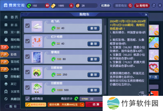 这位玩家现在虽然是直接购买了5件锦衣或者其他的东西,但是花的钱却特别少,这5件东西最后仅仅只是支付了22点仙玉。原因就是上面这位玩家之前获得了888仙玉的优惠券,这是在双十一发放仙玉优惠券时候给的最高额度的优惠券了。