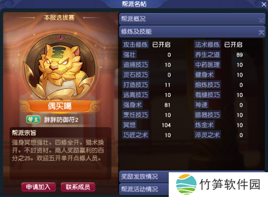 帮派已经开启了四大修炼,而主要研究的辅助技能有冥想、养生之道还有强身术,等级还算中规中矩,适合大家一起来共同发展。