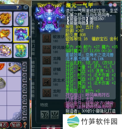 160级高属性男衣,法暴伤害+4.14%,16锻舍利子,熔炼后防御+293,魔力+35,耐力+25。