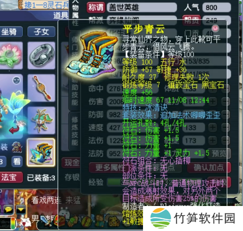 100级冰清诀鞋子,7锻黑宝石,熔炼后防御+57,敏捷+37。