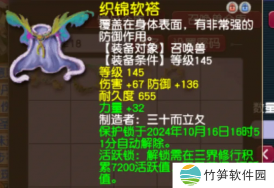 最近新出了一件极品的宝宝装备。这是145级铠甲,伤害+67,防御+136,力量+32,这伤害真的太高了,妥妥的服战级别了,感觉价值能到六位数。恭喜老板成功逆袭,真如制造者名字一样,妥妥的立起来。
