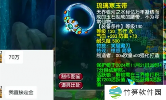 最近一个老板鉴定了一条130级的腰带,直接逆袭了,气血+283,防御+73,特技是笑里藏刀,特效是愤怒+简易,刚出完,去王总直播间展示的时候,没想到一个老板直接开出70万的价格,说行的话,我直接定金,但是老板还是想多宣传一下,等双锁解除了,看看能否有人出价更高!羡慕老板,直接可以去提保时捷718了!