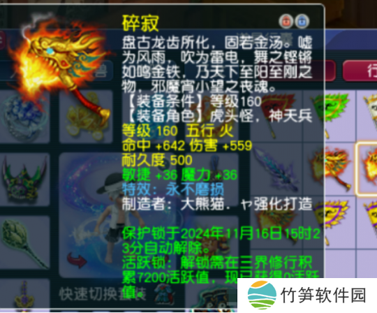 老板锅哥心血来潮,鉴定了几把160武器,结果炸出160伤害556、力耐双加42的神佑流云剑。虽然力量加成歪了,但勉强可以给化生、方寸等门派带,打打帮战联赛英雄大会还是很不错的。