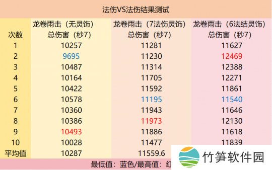 由试验数据可知,佩戴6法伤结果灵饰的情况下,龙卷雨击的输出要明显高于佩戴7法伤灵饰的时候。