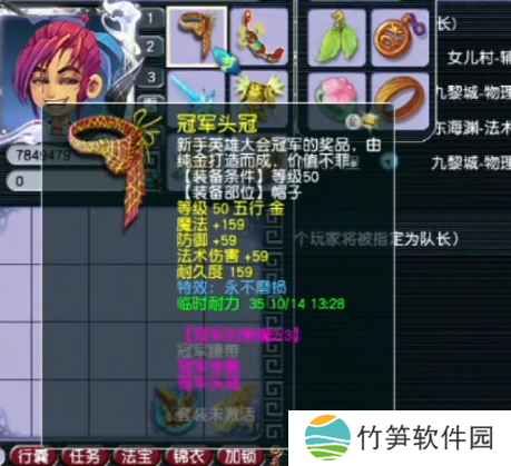 50级冠军头冠,带永不磨损,防御+59,法伤+59。