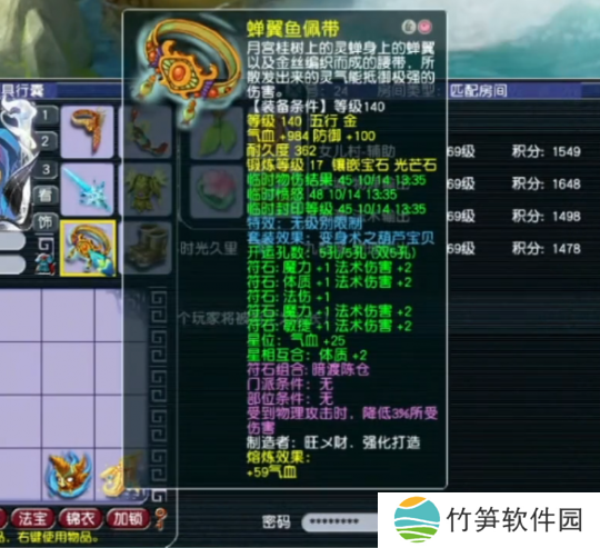 140级无级别腰带,17锻光芒石,熔炼后防御+100,气血+1043。