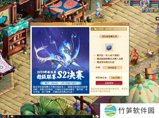 赛事专属系列祥瑞“深海狂鲨”和“朝天吼”开启线上线下限时抢购!2024年群雄逐鹿超级联赛第二赛季“浮空城礼币”将于2024年11月19日11:55至2024年11月23日23:59期间在全部服务器出售,数量有限,先到先得。