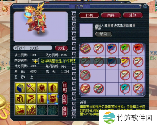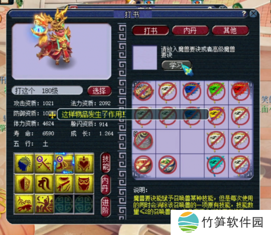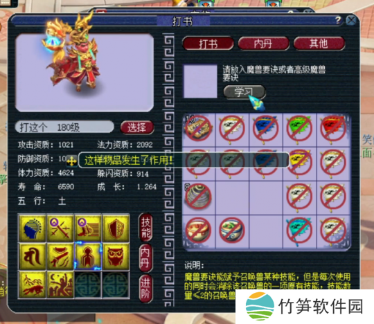 这只宝宝玩家已经带了一段时间了,等级也升到了180级,那么开始改书吧!这只宝宝带了一个高级魔心技能,今天的改书目标就是打掉高级魔心。