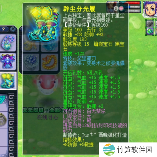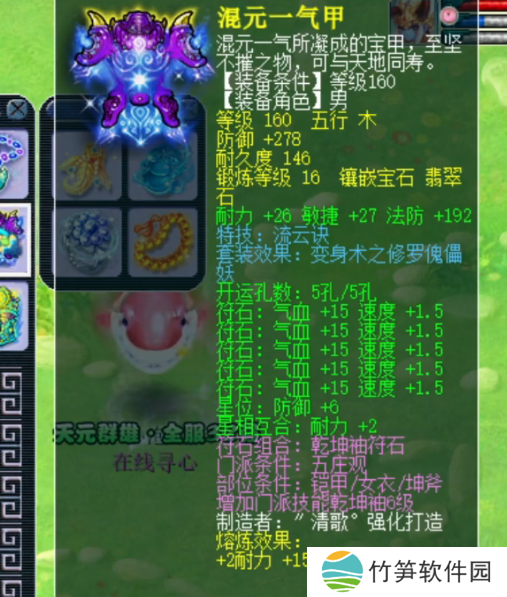 160级流云诀高属性男衣,16锻翡翠石,熔炼后防御+293。