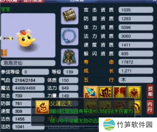 这是8技能全红泡泡灵仙,技能真是独一无二,一是携带义薄云天,可以增加自身等级一定比例的法伤,另外就是带了须弥真言和龙魂,这都是法系至高千亿兽诀的追求。