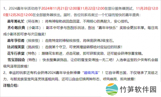 在本周维护后,部分服务器的玩家就可以优先体验到嘉年华的相关活动玩法了。而且在本次嘉年华中上线了新神兽,名叫超级风泽,跟往年一样,各位玩家可以通过刷嘉年华活动,抽取神兽超级风泽。