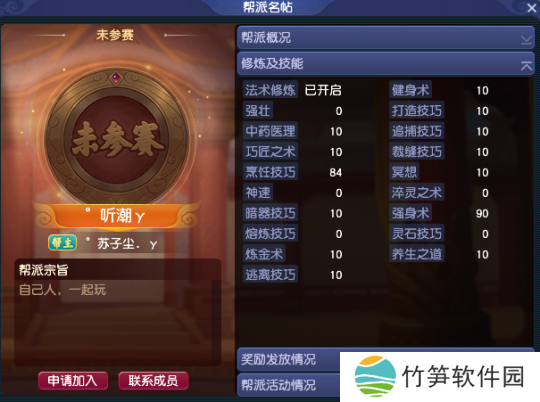 该名帮主在【双龙之战】创建了“听潮”帮,编号为350。目前,他把帮派规模运营到2级。帮派宗旨很简单却深入人心,入帮的小伙伴都有机会成为一家人。