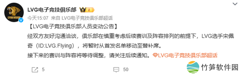 经双方友好沟通洽谈,俱乐部在慎重考虑后续赛训及阵容排列的前提下,LVG选手宋佩奇(ID:LVG.Flying),将暂时从首发名单移动至替补席。