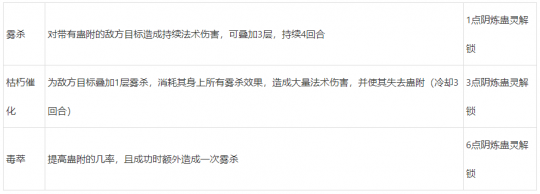 玩家每获得一个”阳炼“试炼能力就会获得1点阳炼蛊灵,玩家每获得一个”阴炼“试炼能力就会获得1点阴炼蛊灵,每获得3点试炼蛊灵(阳炼与阴炼总和),玩家会额外获得1点未分配蛊灵,这一点蛊灵玩家根据自己的需求可以自由分配。阳炼与阴炼能力玩家可同时拥有,玩家不需要去做取舍,玩家只需要思考手上的能力点加试炼能力如何打出高伤害。炼蛊核心”雾杀“,雾杀这个被动技能是跟法伤有关,同时受到法术暴击、法术暴击伤害和法术易伤加成影响,根据对应技能后续雾杀的伤害会越来越厉害,打群怪全靠这个被动。
