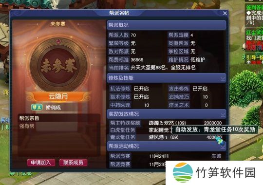 在帮派发展方面,开启了攻击,抗法,猎术三项修炼内容;主研究技能为强身术;与此同时,参与青龙堂,跑商等任务也能获得一定的帮派补助奖励。