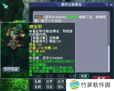 最近一个老板发传音说感谢丁总,感谢王姨,来了一个大的,点开一看125级的缚龙甲,防御+114,伤害+63,力量+30,这个综合伤害高达93点,这个宝宝装基本上也得一万附近了,可以换个最新款的iPhone16promax了,美滋滋呀!