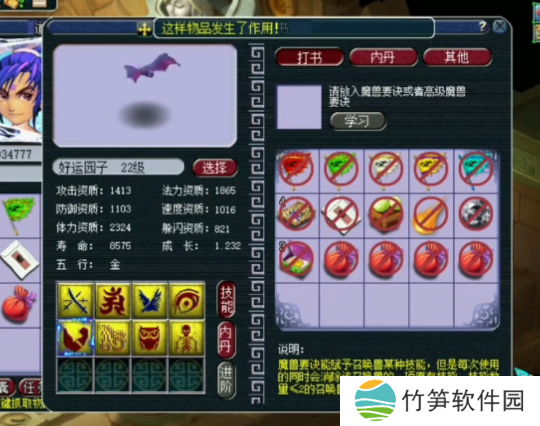 今日,我们来为一只较为少见且等级较低的召唤兽——大蝙蝠进行打书。尽管大蝙蝠作为单内丹召唤兽,在属性上相较于多内丹召唤兽有所差距,但其独特的造型却深受许多玩家的喜爱,玩家购入一只诸天正法大蝙蝠胚子进行打书。