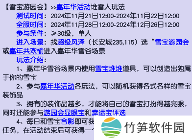 今年嘉年华同去年一样,都有“雪宝”活动。大家今日上线之后,就可以将背包中的雪宝放在“嘉年华雪谷”中,如果不小心丢掉则需要前往超级风泽处领取。