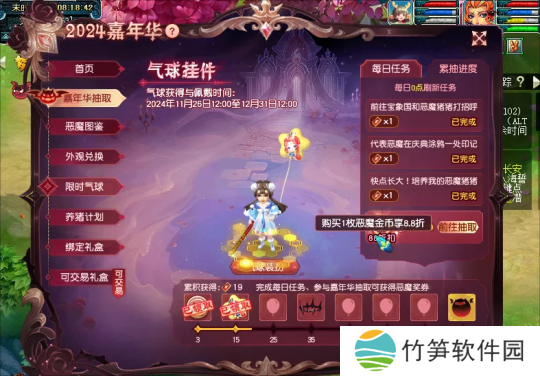 小编要给各位玩家说一个可以白嫖恶魔猪猪的方式。首先是各位玩家可以通过限制气球和养猪计划来获得两次免费抽取的机会。再之后就是完成气球挂件的每日任务之后是可以享受88折优惠的。嘉年华活动总共会持续到12月31日,也就是各位玩家可以拥有36次的88折的抽取机会。