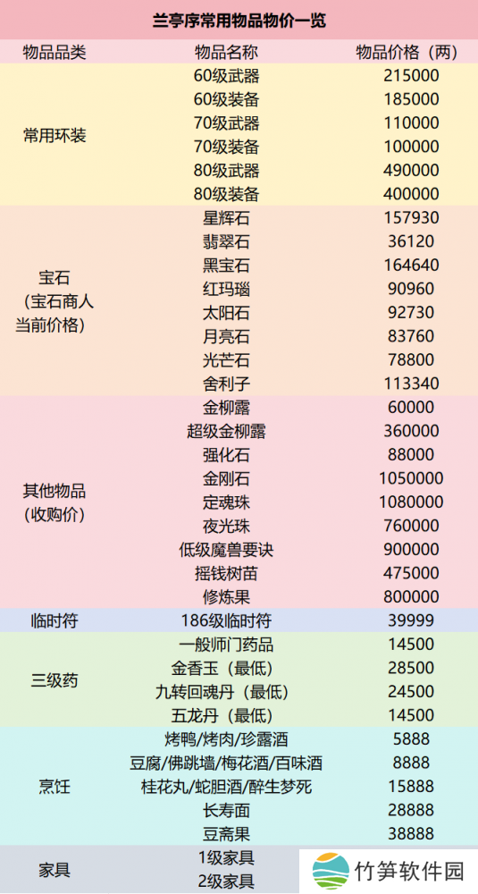 兰亭序常用物品的物价情况如上