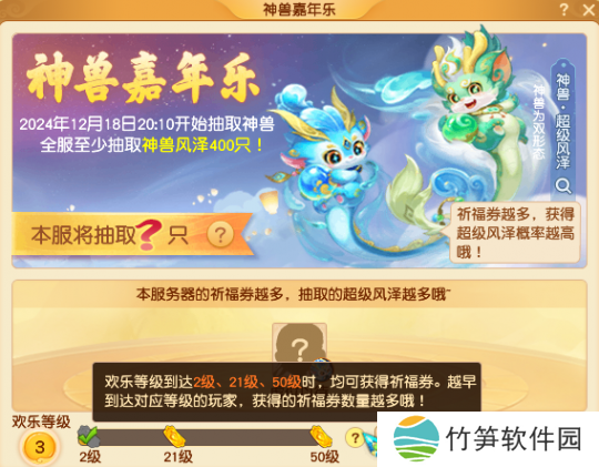 将嘉年华狂欢盛典等级提升至2级、21级、50级时还可以获得祈福券,祈福券可以用来抽取本服的超级风泽,祈福券越多、中奖几率也就越高。