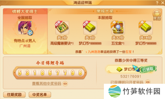 每日参加小副本后,还可以获得一个锦鲤号码,锦鲤号码不仅可以获得抽神兽的资格,还能在本服抽取特等奖、一等奖、二等奖和三等奖,其中特等奖会抽出2本高级魔兽要诀和3份888W的梦幻币奖励。