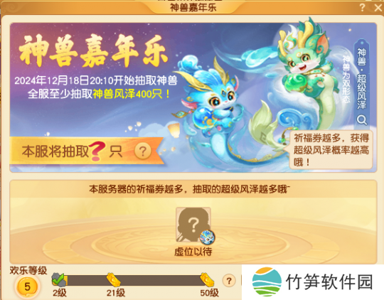 在本次嘉年华活动中有本服抽奖机制,欢乐等级越高,能拿到的祈福券数量也就越多,中奖几率也就越高。当欢乐等级到达2级、21级、50级后,必定获得祈福券。需要注意的是,当欢乐等级到达21级或50级时,将根据在本服务器中到达该等级的先后顺序,发放不同数量的祈福券。